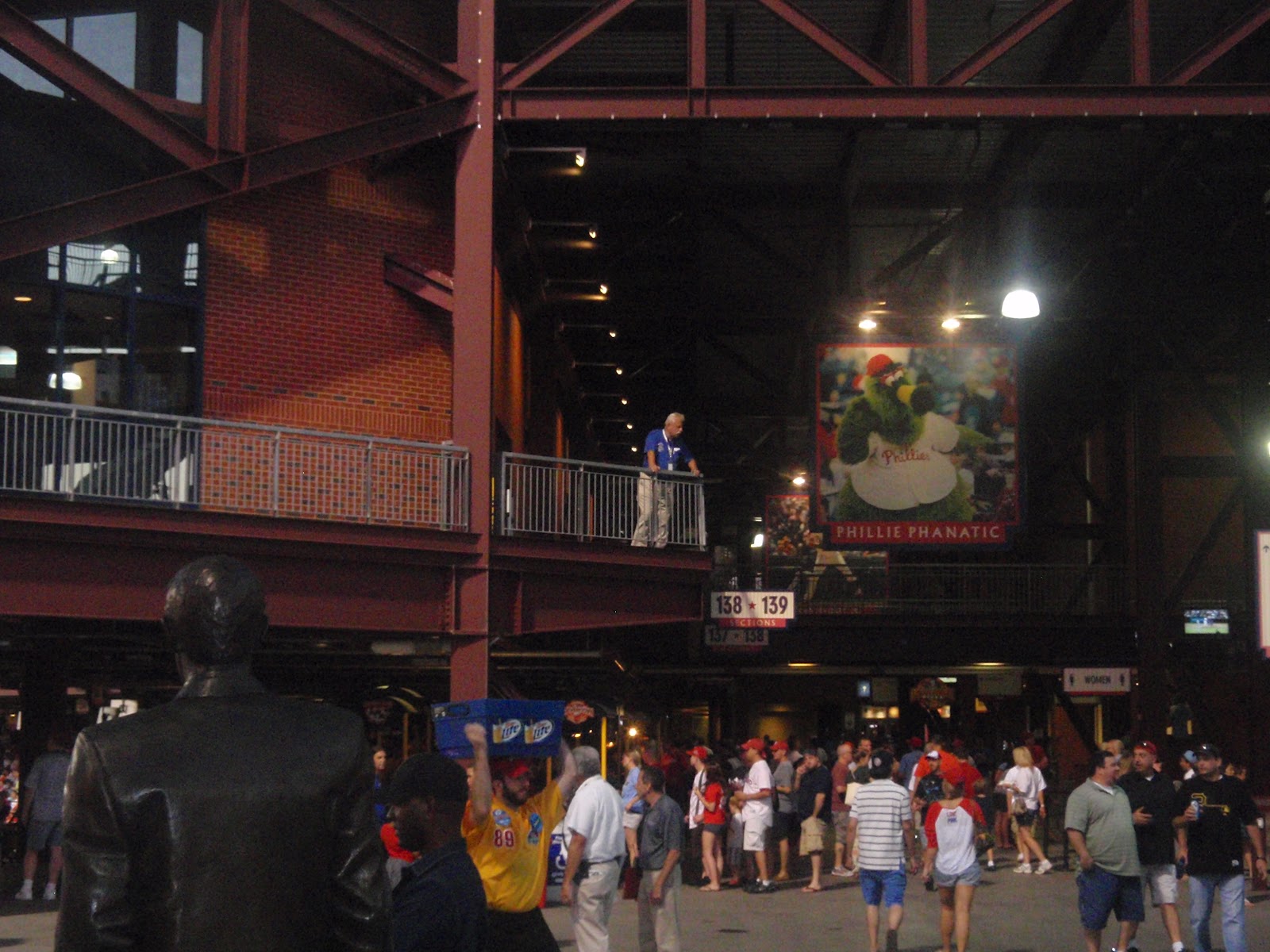 At 6:15, we crossed the street to Citizens Bank Ballpark. Citizens is a big, fun stadium. It's clean. It has bright colors. The scoreboard is great. And it houses the Philly Phanatic, one of the few tolerable mascots in sports. With our next stop in New York, where Ari lives and I used to live, this was our last true road game. Philadelphia didn't disappoint: